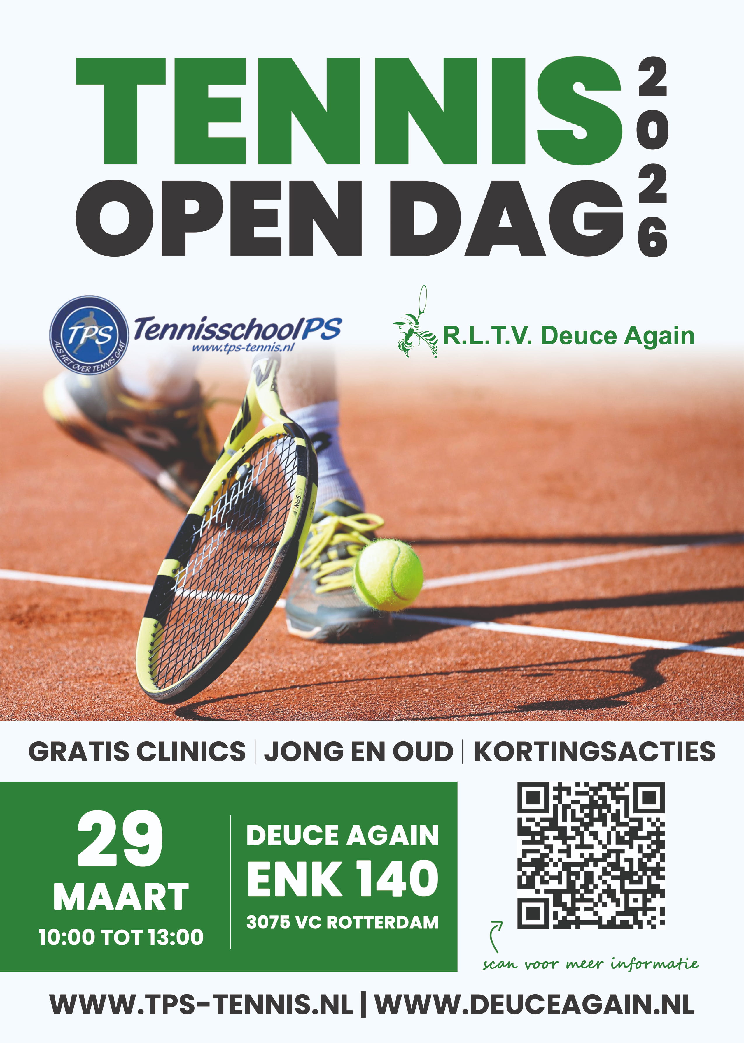 Wil je (weer) tennissen of kennismaken met een actieve tennisvereniging in Rotterdam-Zuid? Kom naar de Open Dag van Deuce Again en ervaar zelf waarom onze club dé plek is voor tennisliefhebbers van alle niveaus. In samenwerking met TPS-Tennisschool bieden we een sportieve en gezellige ochtend vol tennis, informatie en leuke activiteiten.